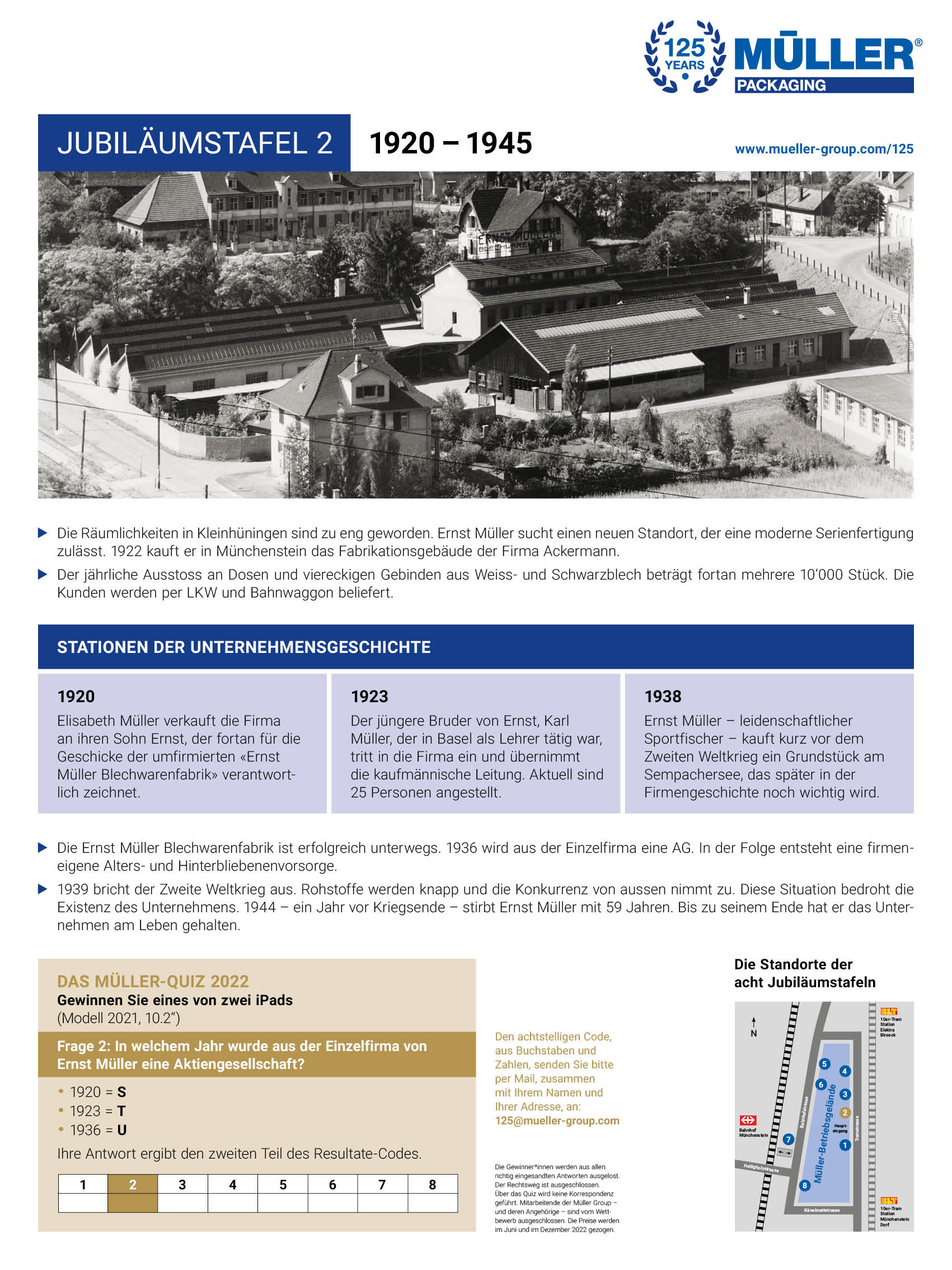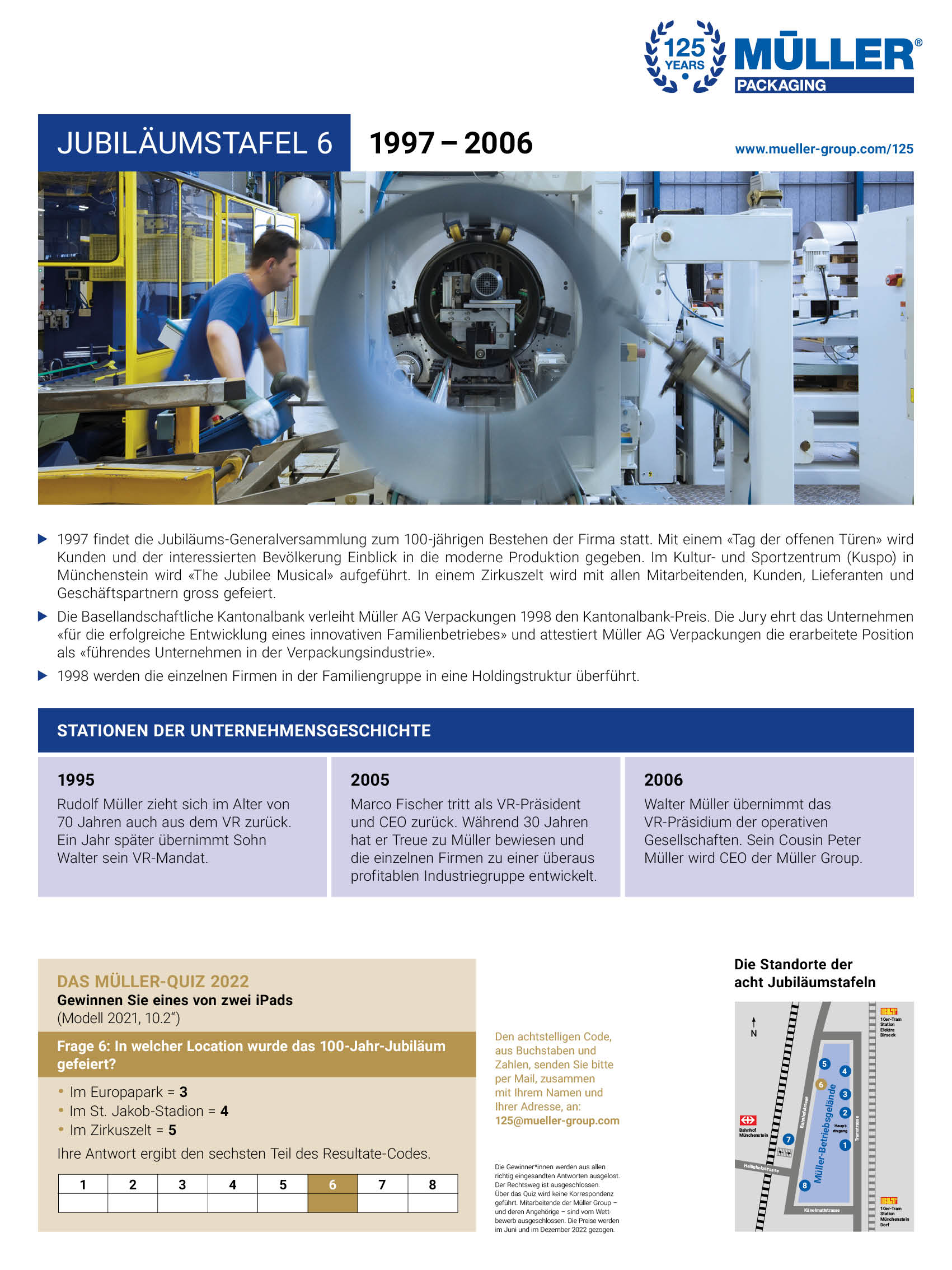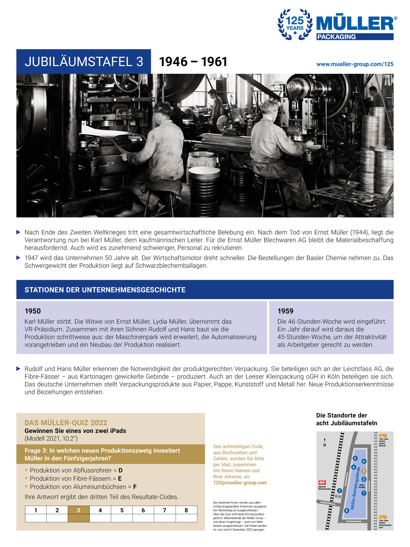 Personen, die an historischen Ereignissen und geschichtlichen Zusammenhängen Freude haben, ist derzeit ein Abstecher ins Industriegebiet Münchenstein empfohlen. Auf acht Jubiläumstafeln werden Menschen und Ereignisse aus der 125-jährigen Unternehmensgeschichte von Müller AG Verpackungen vorgestellt. Nach dem kurzen Marsch zu den Jubiläumstafeln rund ums Betriebsgelände stellt sich das Gefühl ein, dass in der Müller-Historie viel gewirkt und bewirkt wurde.