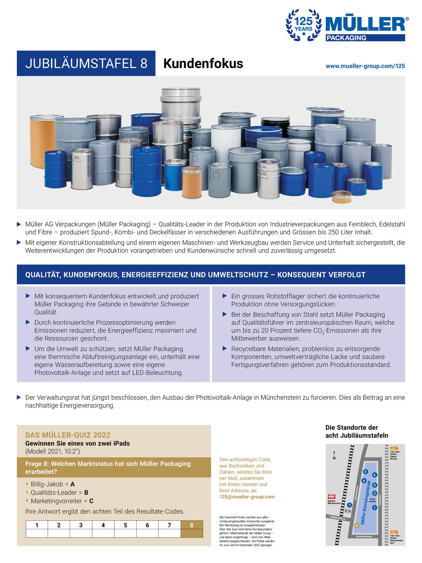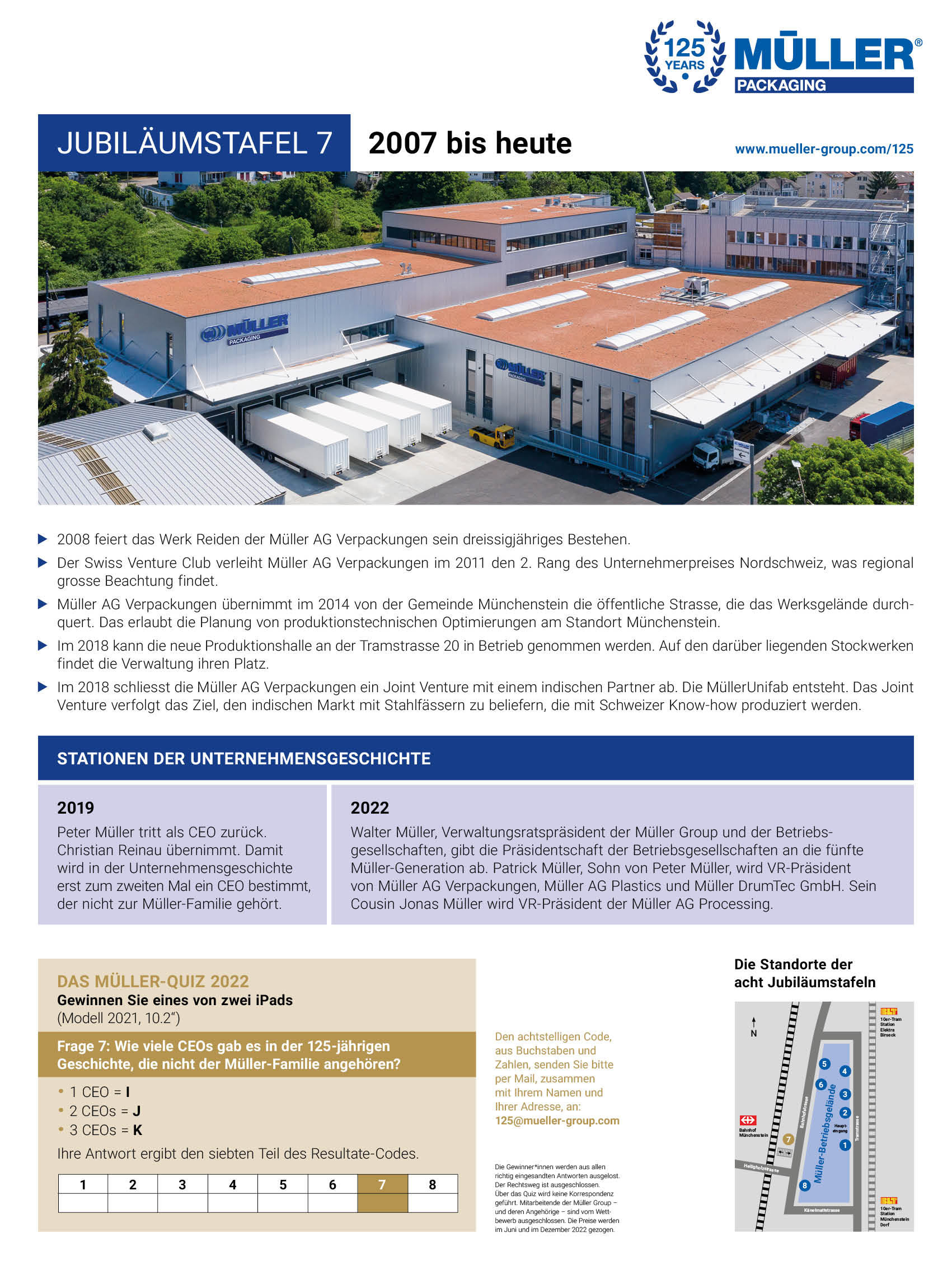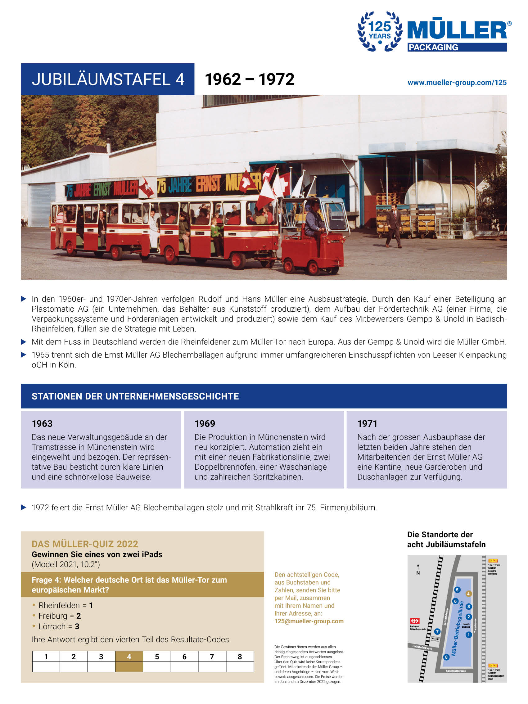 Personen, die an historischen Ereignissen und geschichtlichen Zusammenhängen Freude haben, ist derzeit ein Abstecher ins Industriegebiet Münchenstein empfohlen. Auf acht Jubiläumstafeln werden Menschen und Ereignisse aus der 125-jährigen Unternehmensgeschichte von Müller AG Verpackungen vorgestellt. Nach dem kurzen Marsch zu den Jubiläumstafeln rund ums Betriebsgelände stellt sich das Gefühl ein, dass in der Müller-Historie viel gewirkt und bewirkt wurde.