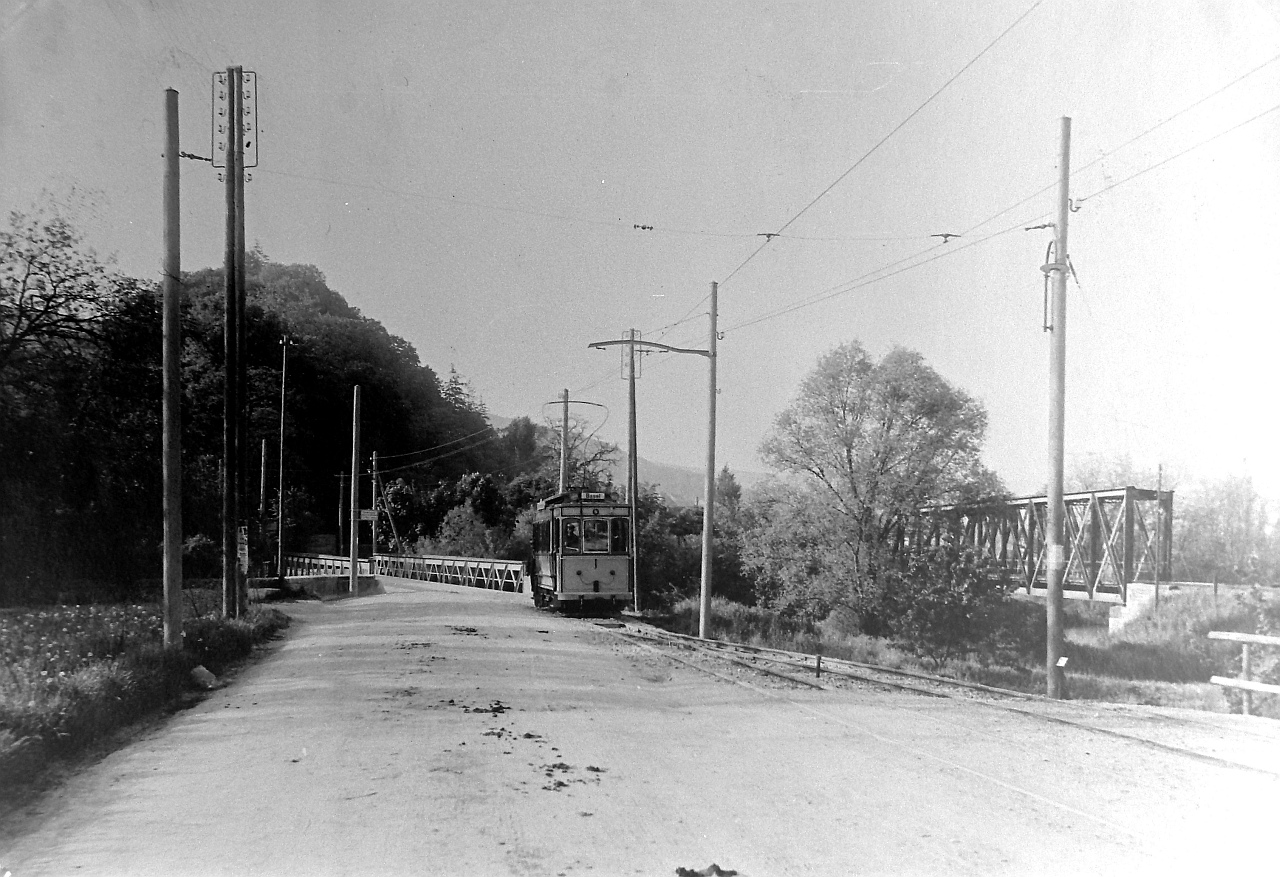 Die Strassenbrücke über die Birs beim Bruckgut, rechts die Eisenbahnbrücke. Die Birseckbahn fährt hier noch eingleisig auf der Strassenbrücke. Aufnahme um 1920 (Bild: Bürgergemeinde Münchenstein). 1922 wird an Stelle der bisherigen, von Tram und Autos gemeinsam benutzten und engen Birsbrücke in Münchenstein, eine neue allein für die Bahn gebaut. Ab 1925 wird die ganze Strecke zwischen der Neuen Welt und Brown Boveri doppelspurig.