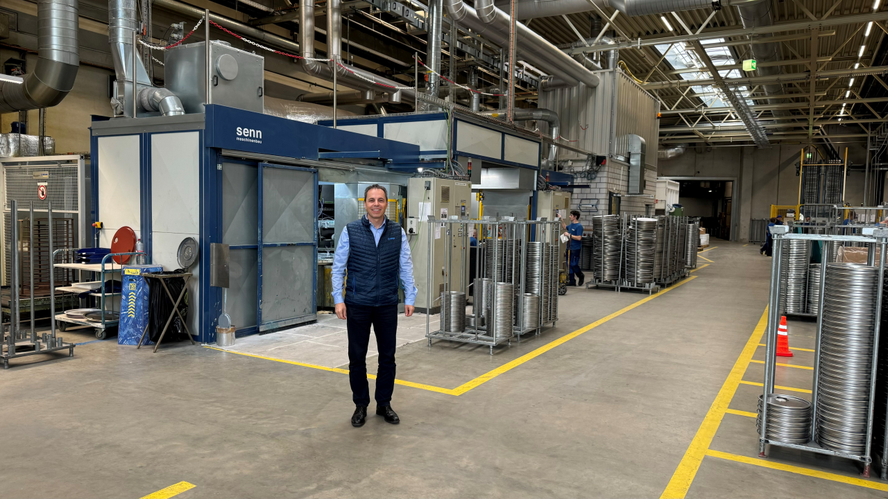 Roland Tanner vor der Deckel- und Bodenlackieranlage im Werk Münchenstein.