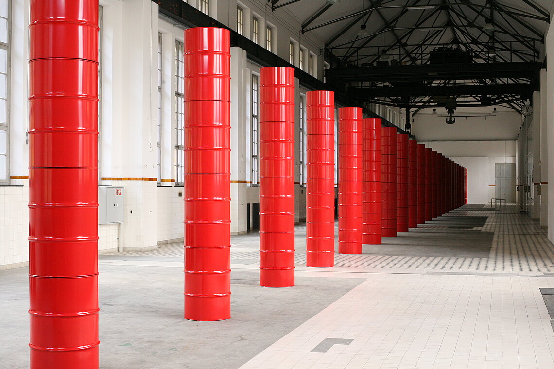 Hundert rote Industriefässer in einer 10'000 Kubikmeter grossen Halle