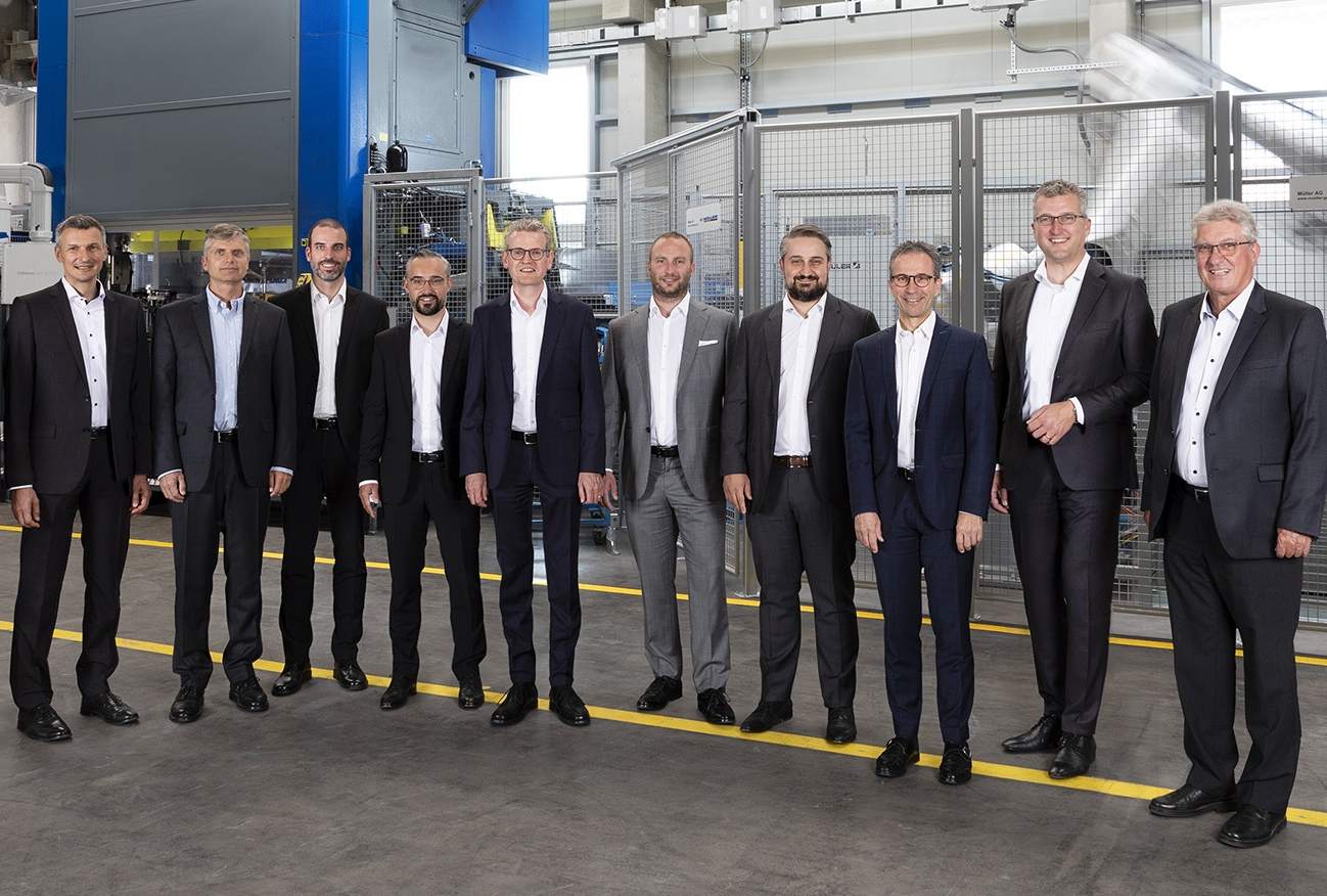 Von links: Fabrice Monti di Sopra, Thomas Storrer (CEO Geschäftsbereich Processing), Jonas Müller (VR-Präsident Müller Processing), Patrick Müller (VR-Präsident Müller Group, VR-Präsident Müller Packaging, VR-Präsident Müller Plastics und VR-Präsident Müller DrumTec), Christian Reinau (CEO Müller Group, CEO Geschäftsbereich Packaging und CEO Geschäftsbereich Systems), Ueli C. Müller, Daniel Müller, Andreas Schmid (CFO Müller Group), Dr. Mark Eichner (VR-Sekretär) und Peter Müller.