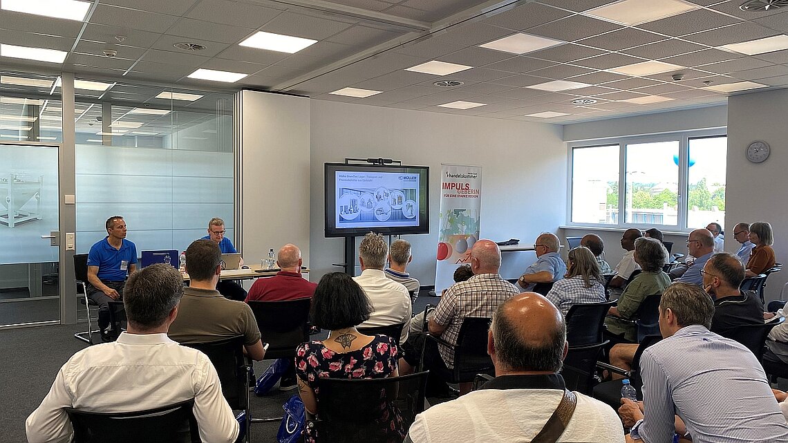 Den Betriebsrundgang eröffnet haben Mitglieder der Handelskammer beider Basel. Als Event im Event wurde das beliebte Format des Wirtschaftsverbandes «Mitglieder stellen sich vor» rege genutzt, um die Mitgliedsfirma Müller AG Verpackungen kennenzulernen. Dieser Anlass endete – in den luftgekühlten Räumlichkeiten von Müller Processing im dritten Stock – mit einer frischen Gruppenpräsentation von Christian Reinau (CEO Müller Group) und ein paar feierlichen Jubiläumsfolien von Roland Tanner (Managing Director Müller Packaging). Denn das 125-Jahr-Jubiläum des Familienbetriebes, das seit Anfang 2022 im Verwaltungsrat durch die fünfte Müller-Generation geführt wird, war der Grund für den Tag der offenen Tür.