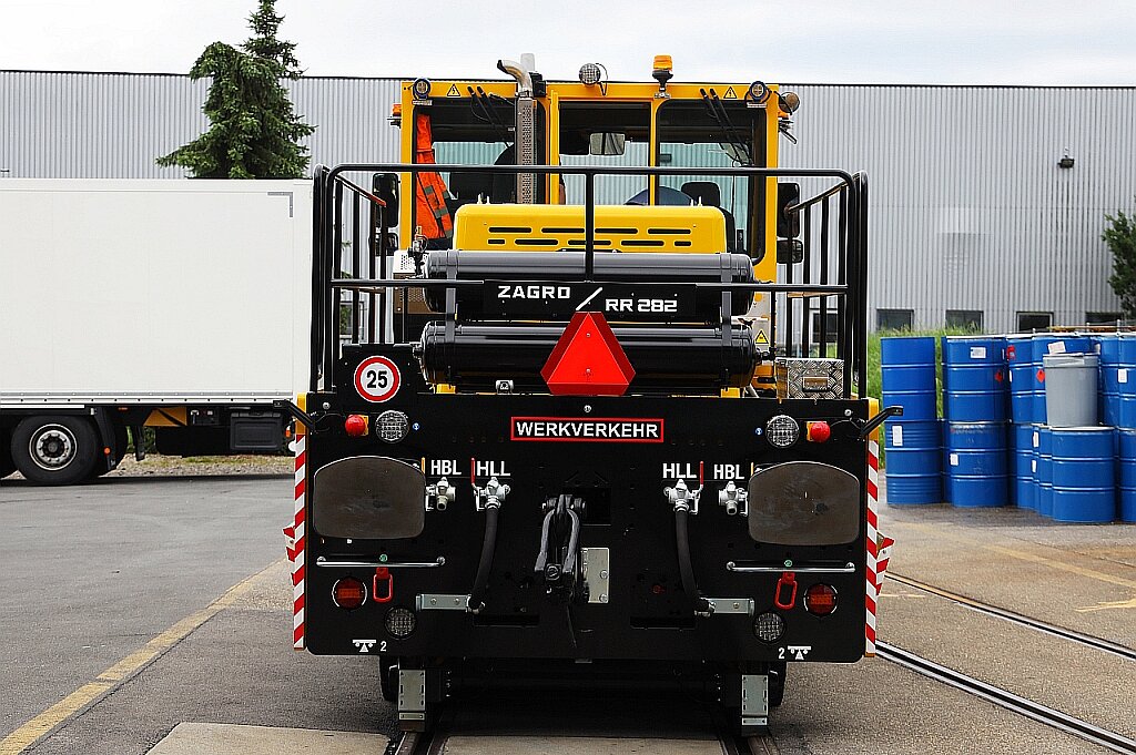 Im letzten Jahr hat sich abgezeichnet, dass die alte Lokomotive der Marke DEUTZ in nächster Zeit ausrangiert werden muss. Bei der gemeinsamen Marktsondierung wurden verschiedene Optionen analysiert und bewertet. Schlussendlich fiel die Wahl auf das Zweiweg-Fahrzeug TERBERG/ZAGRO RR282. Dieses kann – wie der Name vermuten lässt – auf und neben der Schiene fahren, was kürzere Manöverstrecken möglich macht und erlaubt, dass Wartungen und Reparaturen abseits der Schienen durchgeführt werden können. Das neue Fahrzeug kombiniert bewährte LKW- und Bahntechnologien und ist für eine Zugkraft von 2'800 Tonnen ausgelegt.