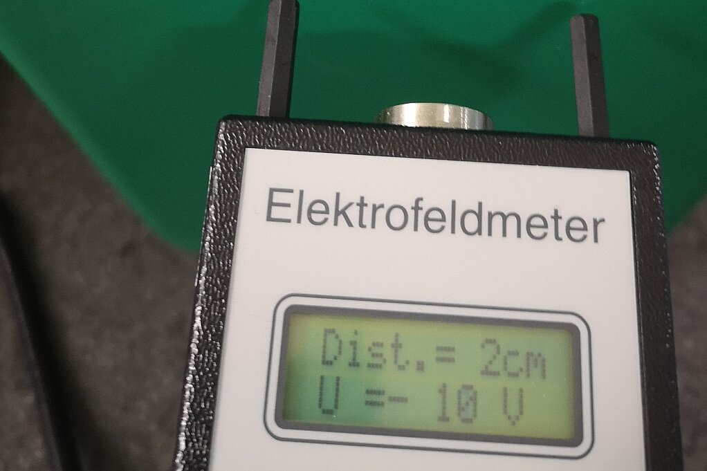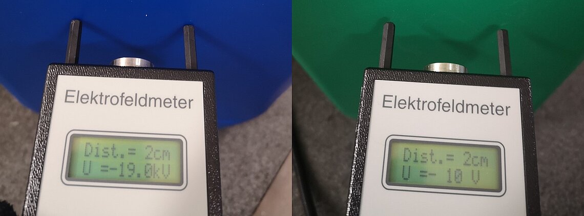 Um die elektrostatischen Aufladungen der Gebinde aufzuzeigen, hält Horst Meier abwechselnd einen Elektrofeldmeter an zwei Kanister. Die Unterschiede sind gross: Der blaue Kanister, der eine isolierende Aussenwandoberfläche besitzt, zeigt 19'000 Volt an und hält diese Spannung auch über eine lange Zeit. Der grüne ableitfähige MultiCan-Atex hingegen zeigt bei der Messung nur 10 Volt an. Auch mit einer Aufladung auf ein paar hundert Volt wäre er immer noch im sicheren Bereich, weil die Ladungen schnell über die ableitfähige Aussenwand gegen die Erde abgeführt werden. Hierzu ist erforderlich, dass der MultiCan-Atex-Kanister beim Befüllen und Entleeren geerdet ist.